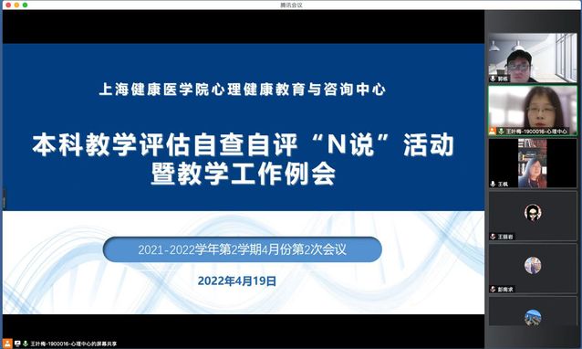 为进一步提高疫情下的教育教学质量,有效推动本科教学评估整改工作,保证教学平稳有序地推进,4月19日下午,心理健康教育与咨询中心通过线上腾讯会议平台召开本科评估自评自查“N说”——“说课程”活动暨期中教学工作会议,中心专兼职心理教师参加,会议由心理学教研室主任王叶梅副教授主持。