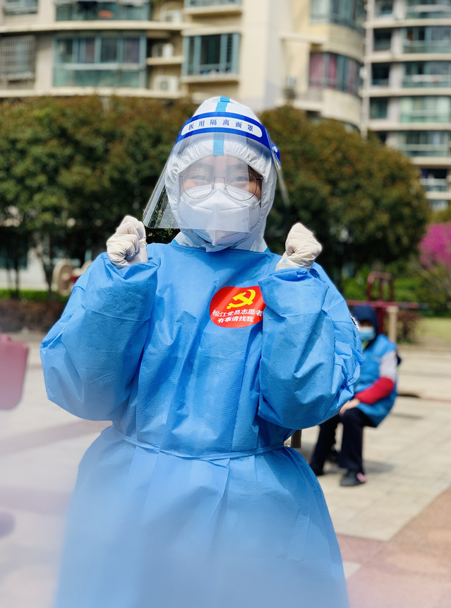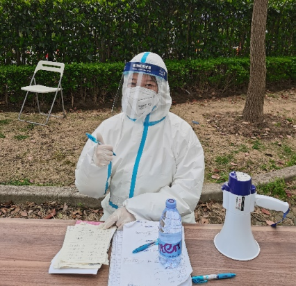 沈思佳同学主动报名成为松江区中山街道茸星社区志愿者。在全员核酸之际,她穿上厚重的防护服,化身“大白”,主要负责采样前的扫码登记以及维持现场秩序的工作。闷热的天气下,汗水浸透了衣服,但她全然顾不上,全力以赴地帮助社区完成了防疫工作。
