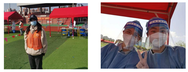 作为B组核酸检测类志愿者,她积极配合负责老师,保障北苑苑区核酸检测工作顺利进行,主要负责维护检测区秩序,引导同学们分组有序地测核酸。
