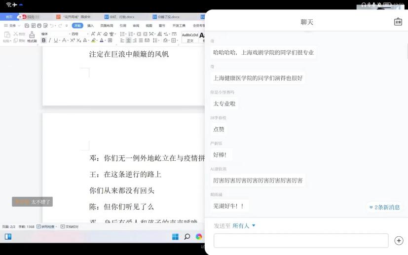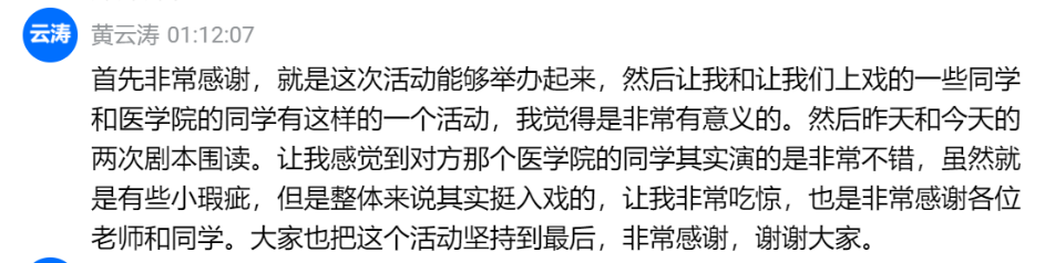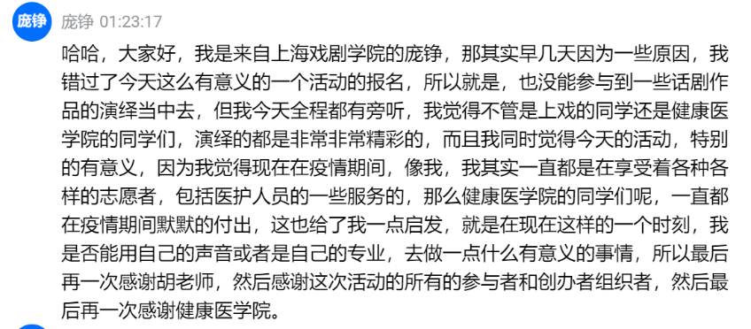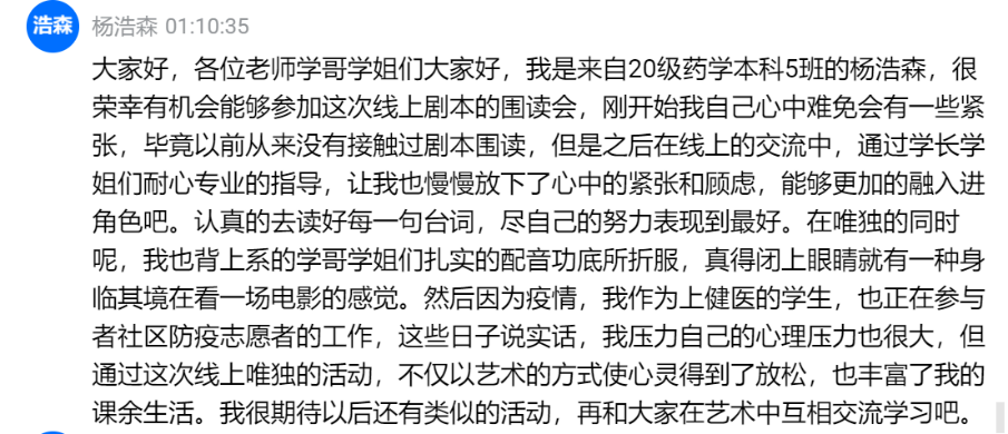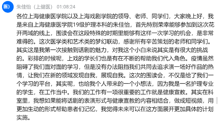 活动结束后,两校同学们意犹未尽,继续进行了在线云交流,纷纷表达了以“艺”抗疫,共同守“沪”的激动心情。医学院的同学们深深感受到了戏剧艺术的精彩和魅力,戏剧学院的同学们也表达了对医学和医务工作者的感谢和敬意。疫情期间,两校同学们通过本次云联谊活动,增进了了解和友谊,相约待疫情散去,线下再相聚。(北苑综合办、校团委、护理与健康管理学院)