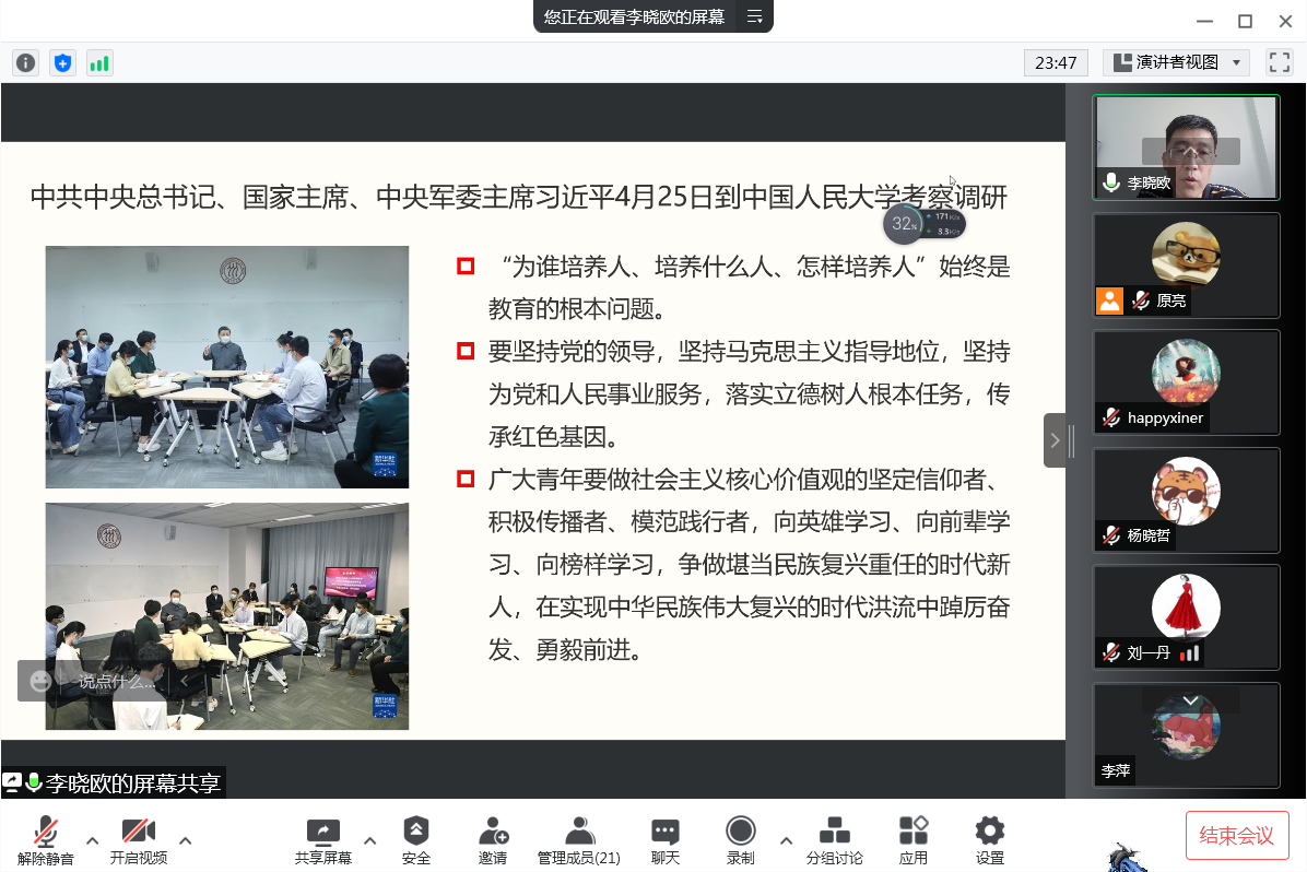 最后,李晓欧和参会人员再次共同学习了习近平总书记4月25日在中国人民大学考察调研时的重要讲话精神,希望全体教师坚持立德树人、德技并重,保证“育人与育才统一”,尤其是疫情期,要坚持“教学法更贴近学生”原则,合理利用多种媒体手段,注重传统方法与信息化手段结合, 全面提升教学质量。