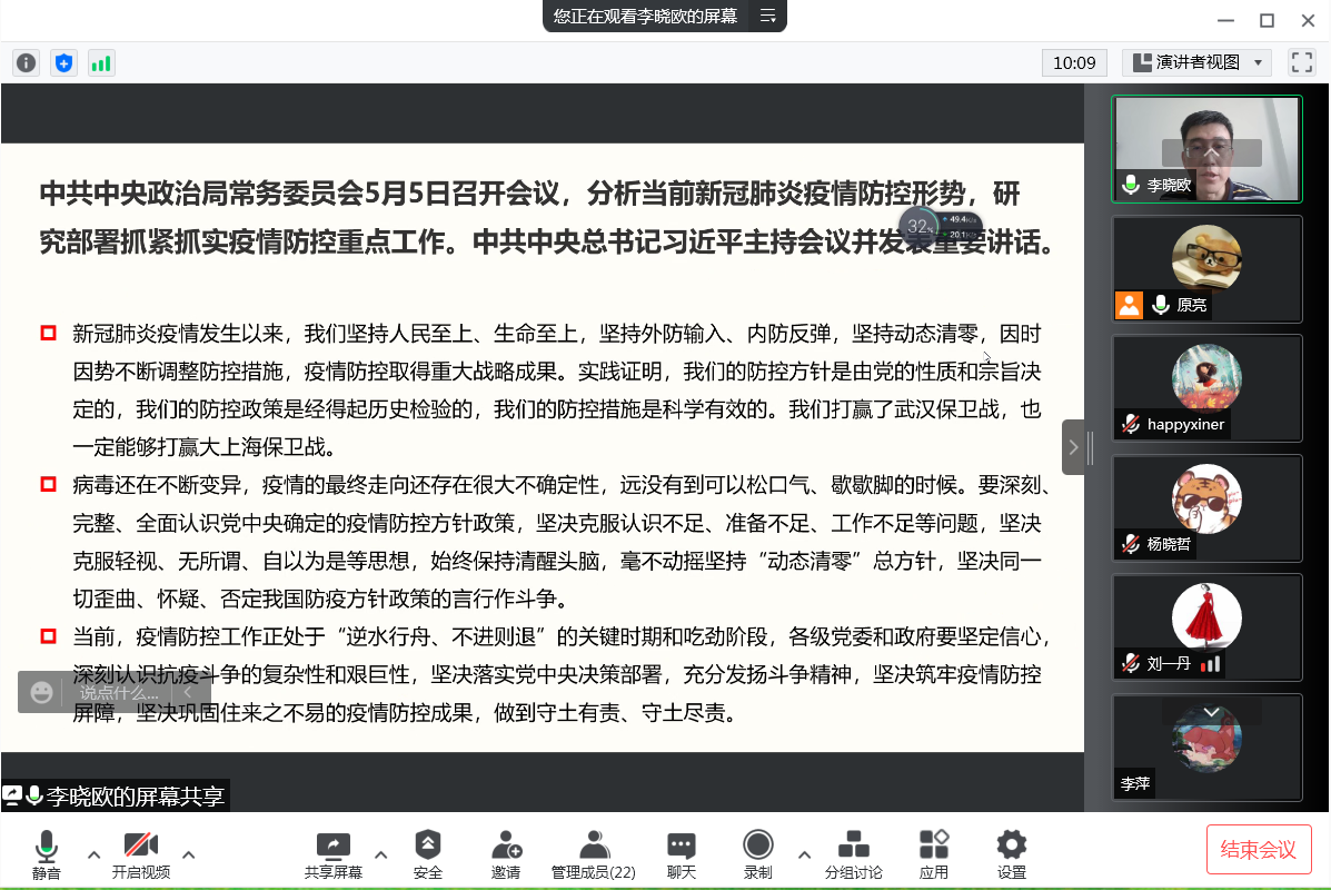 首先,李晓欧带领参会人员学习了“习近平总书记5月5日在中共中央政治局常务委员会上关于疫情防控的重要讲话精神”、“上海市委书记李强5月5日在传达学习贯彻习近平总书记主持召开的中共中央政治局常务委员会会议精神时提出的工作要求”,要求学院各党支部和师生党员要守土有责、守土尽责,继续发扬不怕疲劳、连续作战的精神,冲锋在前、顽强拼搏,以时不我待的精神、分秒必争的行动抓实抓细教学科研、人才培养、疫情防控等各项工作,发挥好战斗堡垒和先锋模范作用。