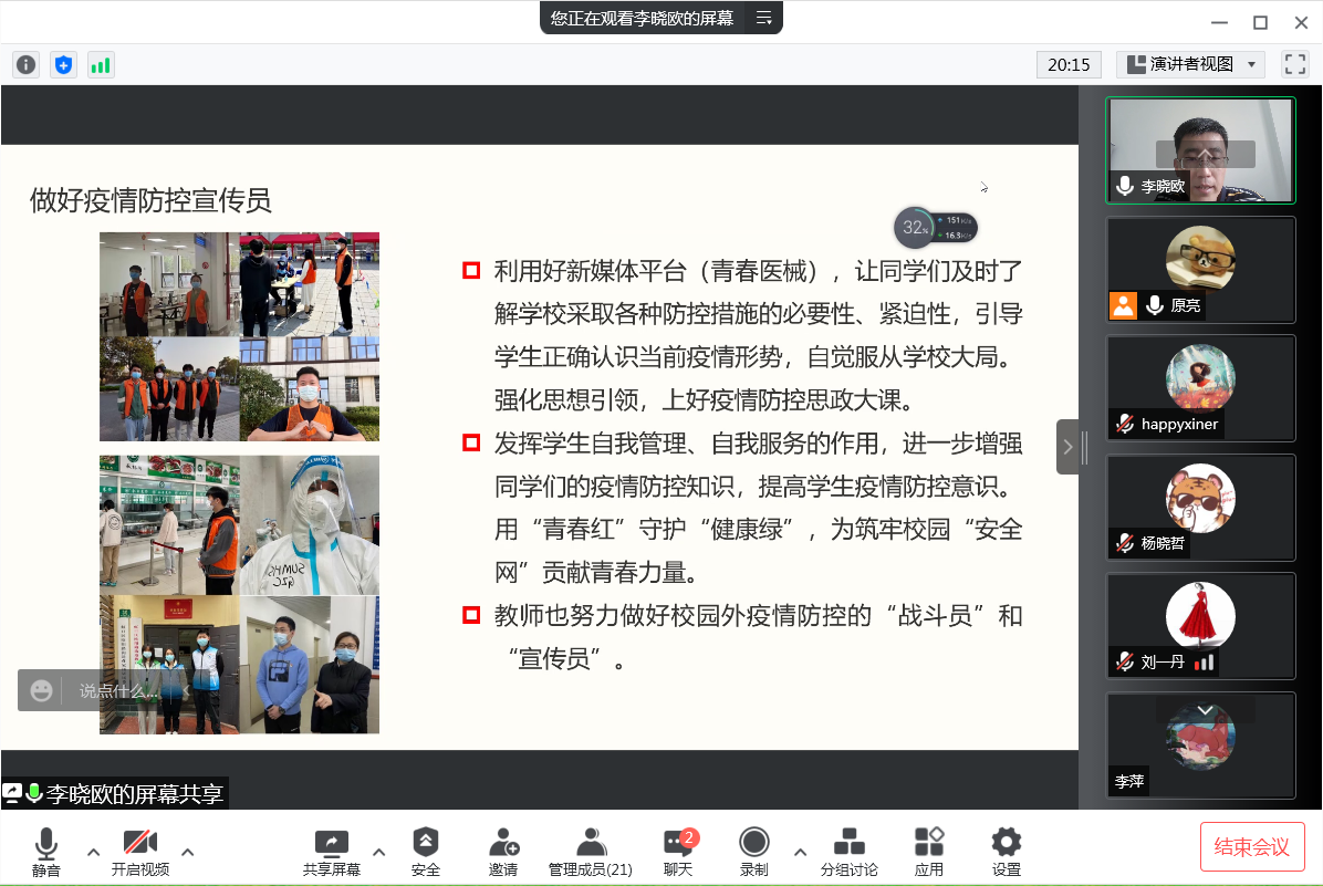 接着,李晓欧对校内外党组织和党员提出号召,不仅要做好疫情防控宣传员,“利用好新媒体平台(青春医械),让同学们及时了解学校采取各种防控措施的必要性、紧迫性,引导学生正确认识当前疫情形势,自觉服从学校大局;强化思想引领,上好疫情防控思政大课;发挥学生自我管理、自我服务的作用,进一步增强同学们的疫情防控知识,提高学生疫情防控意识;用‘青春红’守护‘健康绿’,为筑牢校园‘安全网’贡献青春力量”,而且要做好疫情防控护航员,“留守校园的教师(12人次)秉持着‘关键时刻冲得上去,危难关头豁得出来’的信念,勇于担当,勇于奉献;把所需资源配置到第一线,把关心关爱汇聚到第一线,用心守护校园的安全有序,用爱守护学生的生命健康;辅导员是学生思想的引导员,引导同学们提高政治认识,提升共情能力;校外师生志愿者(下沉干部),他们舍小家为大家,用非凡的行动力和凝聚力见证了勇者无惧,践行了使命担当”。
