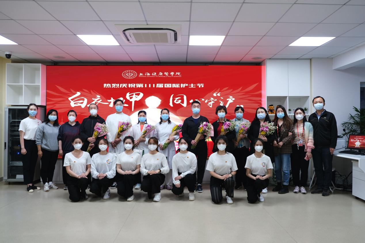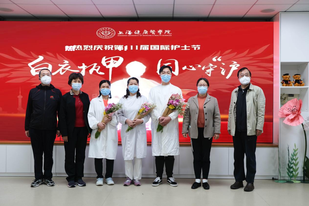 上海健康医学院自3月中旬启动准封闭管理以来,附属崇明医院的8位“大白”医护人员临危受命,进驻校园内开展疫情防控核酸检测工作,始终奋战在抗疫一线,守护全校师生员工安全和健康。5月12日晚,在第111届国际护士节来临之际,护理与健康管理学院在北苑九号楼举办“感恩有你,最美‘天使’——慰问驻校医护活动”。校党委书记郭永瑾,校长吴韬,党委副书记、副校长唐红梅,副校长陈小冰,附属崇明医院在校“大白”医护人员出席慰问活动,教务处处长王莉,学生处处长吕晓丽,护管学院院长朱爱勇、党总支副书记陈娅俊、学院在校辅导员以及学生代表参加了本次活动。