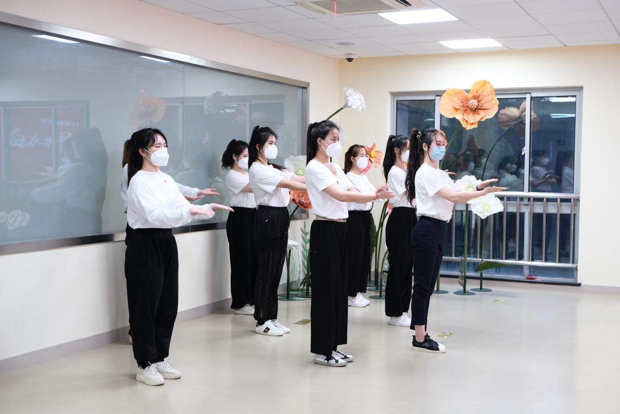 活动中,辅导员胡雪东老师带领学生代表们为“大白”医护人员表演了手势舞蹈《听我说谢谢你》。护管学院同学因地制宜,采摘校园内缤纷野花,精心制作手捧花束,并绘制贺卡。校领导以贺卡、鲜花,以及慰问品表达了对附属崇明医院“大白”医护人员的辛勤付出,并祝福白衣天使们节日快乐!