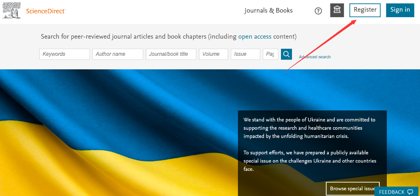 第一步:先使用机构邮箱注册个人账号。如果已经注册,可直接跳至Step 2。如果尚未注册,用浏览器打开SD主页(https://www.sciencedirect.com/),点击页面右上角的“Register”,用机构邮箱(如:xxxx@sumhs.edu.cn)注册SD个人账号。