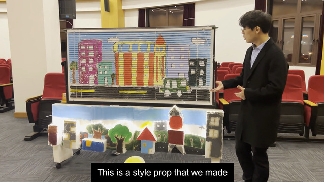 3月突如其来的疫情封控,打乱了队员们备赛2022年OM线上世界赛的节奏。在面临严峻的疫情挑战时,作为医学生,大多参赛队员都义不容辞地奔赴抗疫一线,参加防疫志愿者工作,有的担任抗原检测志愿者,有的负责维持核酸检测秩序等。在完成志愿者工作之余,队员们积极备战世界决赛,利用碎片时间进行了多次线上讨论剧本道具、交流解题思路并修改方案。例如,在工程类赛题中,为了节约时间和控制成本,队员们省去体积较大的道具设计,巧妙地设计了一个主舞台和一个微观舞台,并将评分点中“回形针的使用”运用在微观舞台的搭建上,用回形针制作成不同的景观,以此达到不同景别之间的来回转换,调动观众的视觉感官。比赛过程中,队员们展现了极强的创造力、表现力和团队协作能力,最终富有创意的参赛作品获得了裁判们的一致好评。今年的古典类赛题与以往不同,主题是音乐剧,因此除了道具和剧本的完善,音乐风格也是相当重要的一个部分。参赛队创新采用翻转背景板的方式,在背景板的正反两面都做了设计,其中利用麻绳围成高脚杯、碗、帽子以及展览柜里的展览灯等立体物品道具,贴合音乐剧中原始部落的“原始感”,在国际赛中受到评委的好评。