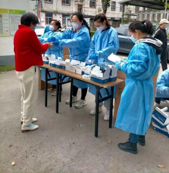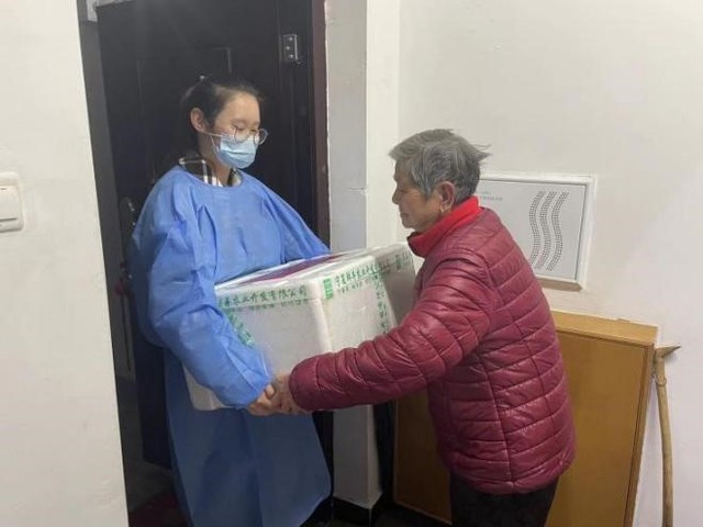 由于防疫物资缺少人力分发刘诗墨同学就主动参与这项志愿服务,同社区内其他志愿者一起,搬运物资、分发抗原检测试剂,组织居民下领取并做好相应的记录。对于一些行动不便的老人,她将物资搬运上楼,并且悉心分配,给老人带去温暖。