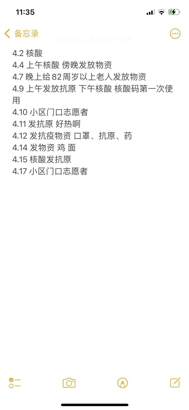 以下是刘诗墨同学四月初的志愿者任务表,我们看到的是一名将为人民服务的宗旨践行到细处的新时代青年。她说“在队伍中,有一位老党员开着残疾人的车奋战前线,备受鼓舞。同时,我的身边有无数党员同志冲在先战在前。作为一名党员发展对象,我也要向他们学习,不惧危难,冲在疫线,全心全意为人民服务。”
