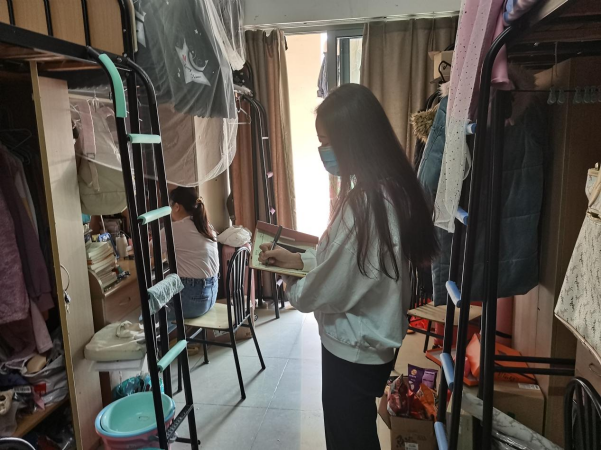 她忙碌在校园的各个角落:在北苑全员核酸检测中她担任签到志愿者,统计核查医学技术学院的核酸检测完成情况;每周一,她担任12号楼的垃圾分类引导志愿者,指引同学们正确进行垃圾分类。工作中的她勤勤恳恳,如今,志愿者工作已成为她生活中必不可少的一部分。此外,她也深入寝室关心同学,为同学们排忧解难,了解封闭管理期间同学们的需求,及时上报给老师,在老师和同学之间起到了桥梁和纽带的作用。