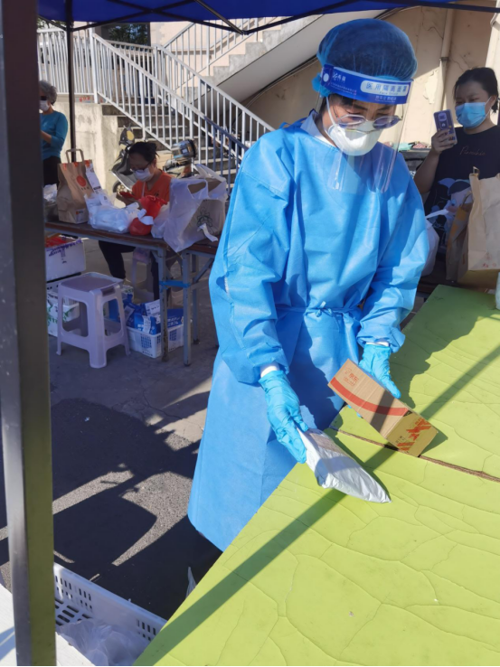 在校外,图书馆老师们的身份不再仅仅是一名老师,他们是可爱的邻居,也是可靠的战友。许多老师下沉支援社区,化身温暖的“大白”和“小蓝”,参与核酸检测、快递收发、物资配送、垃圾清运、数据登记和排查等工作,不惧危险,不言苦累,为社区增添抗疫力量。