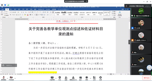 徐小萍最后强调,评建工作是今年学校和学院工作的重中之重,虽然目前受到疫情影响,但仍要有序推进各项工作的落实,保持防疫和评建工作两不误。学院评建工作组要根据学校评建办的进度要求,保质保量完成此次观测点综述撰写和目录完善工作,切实做到以评促建,持续优化。