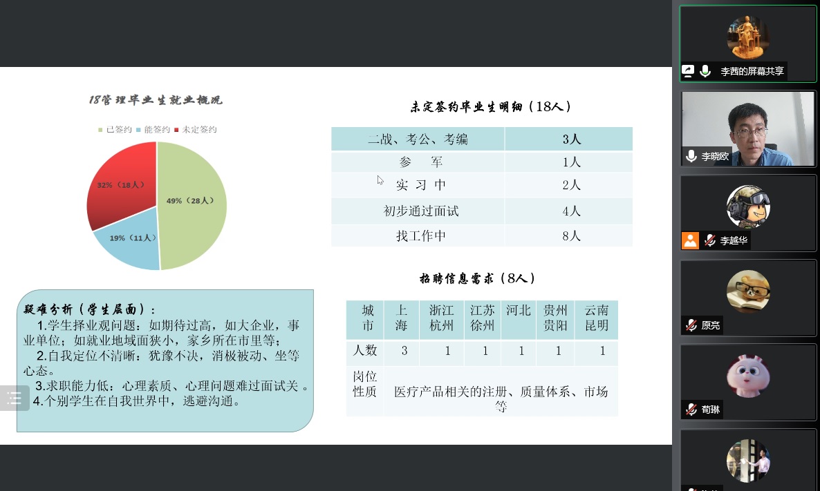生物医学工程专业(本科)、临床工程技术专业(本科)、数据科学与大数据技术专业(本科)、医疗产品管理专业(本科)、精密医疗器械和中日合作临床工程技术专业(专科)毕业班辅导员们分别就每一位未就业毕业生的求职就业进展进行了汇报,并就学生在就业中遇到的问题进行沟通交流,确定下一步工作目标。