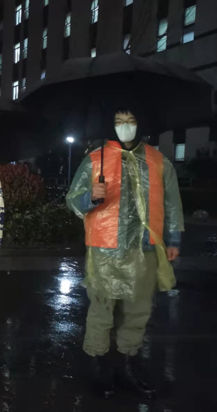在这次学校严格管理期间,21级生物医学工程专升本班的谢柯同学响应学校号召,担任南苑夜间巡逻组的小组长,主要负责南苑夜间巡逻。3月21日召集的志愿者巡逻队当晚就进行南苑的巡逻,虽然天气情况非常恶劣,雨水打湿了全身,但他们没有退缩严格按照计划完成了当天的工作。校园封闭给大家带来了很多的困扰,一位位志愿者同学挺身而出,让大家的生活更便利。他作为一名退伍大学生始终站在一线,充分发扬不怕苦不怕累的精神。