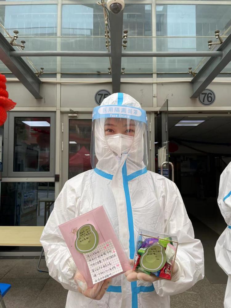 3月17日北苑12号楼准封楼管理中,她统筹管理各项事务安排,忙里偷闲接受采访时说道:“作为上海健康医学院一名普通的辅导员老师,坚守一线是我的职责所在,每一位老师都在各自的岗位中默默付出着。其实这次能够有机会和孩子们真正意义上的同吃同住同生活,对于我来说是非常宝贵的。我们从3月17日凌晨到现在,每天一大早校领导和朱院长就站在楼前为我们所有人保驾护航,最近上海的天气大风夹杂着小雨,核酸检测的医护人员存放医用垃圾的塑料袋都要绑着几层胶带固定,但所有人都义务坚守在岗位上,领导们一站就是一上午,陪伴着我们。作为楼内保护孩子们的我们,基本上每天早上都是5:00起床准备分发早餐和核酸检测工作,全天都没时间能坐下休息一会儿,但每一句:'谢谢老师、老师辛苦了',我真心感觉没有什么是战胜不了的。”
