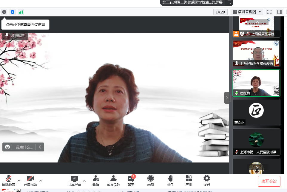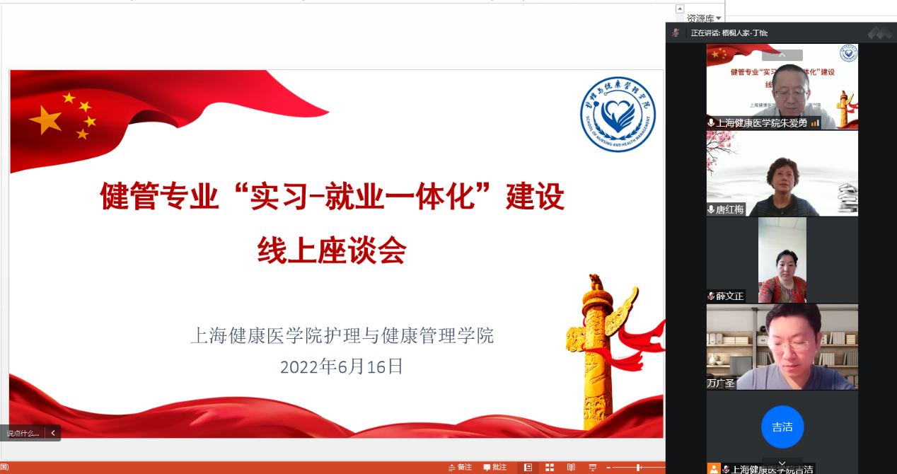 长期以来,用人单位对我校护理与健康管理学院健康服务与管理本科专业学生培养工作给予了大力支持,为加强沟通交流,进一步提升人才培养质量,为用人单位输送高素质应用型人才,6月16日上午,护管学院举办健康服务与管理专业“实习-就业一体化建设”线上座谈会。上海市邮电医院、曹杨社区卫生服务中心、中国太平保险集团等13家用人单位的人力资源部门负责人莅临会议,上海健康医学院党委副书记、副校长唐红梅出席会议并指导;学生处副处长吕晓丽(主持工作)、副处长慈兴强,护管学院党总支书记郭戎静、院长朱爱勇、副院长蒋颖、副院长万广圣、党总支副书记薛文正和2022届毕业班辅导员参加。朱爱勇主持会议。