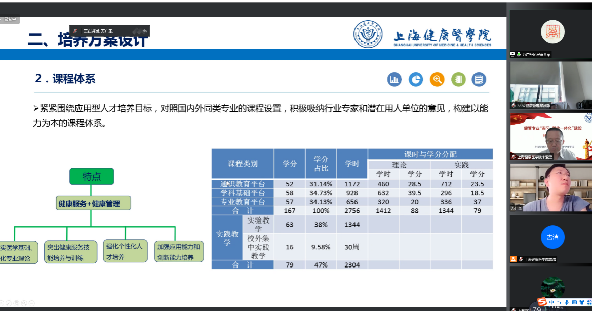 接下来,各用人单位对健管专业的实习工作进行了意见反馈,根据本单位情况提出了人才需求,并对实习就业一体化建设进行了广泛的讨论。用人单位纷纷对学院健管专业同学的综合素质、临床学习和适应能力表达了高度的认可,希望校企之间能够共同开展更紧密的协作,通过申报孵化基地、搭建平台等方式,加强学校与用人单位的合作与交流。如上海嘉会国际医院人力资源部资深经理潘婕、上海邮电医院于学伟老师对我校学生在实习中的表现给予了高度评价;曹杨社区卫生服务中心科教科龚雯静科长、宜川社区卫生服务中心陈吉老师认为可以为健管专业学生拓展家庭医生助理这一具有广阔前景的岗位;上海市第一人民医院人事处时洪凯副处长、上海长海医院临床研究中心GCP办公室高越副教授谈到同学们具备参与科学研究的潜力,可以担任各类科研项目的团队工作;招商信诺健康管理有限责任公司人力资源部陈瑞恺、中国太平保险集团梧桐人家养老社区丁怡经理等认为校企应不断加强合作、提升实习阶段的育人质量,并在会上当场确定了今年计划招聘的人数;上海邮电医院于学伟、周浦医院祝军委两位老师谈到应引导学生充分认识到护理健康管理在人的生命周期中是一个全方位、全周期、全场景的重要纽带,此专业就业前景广阔。