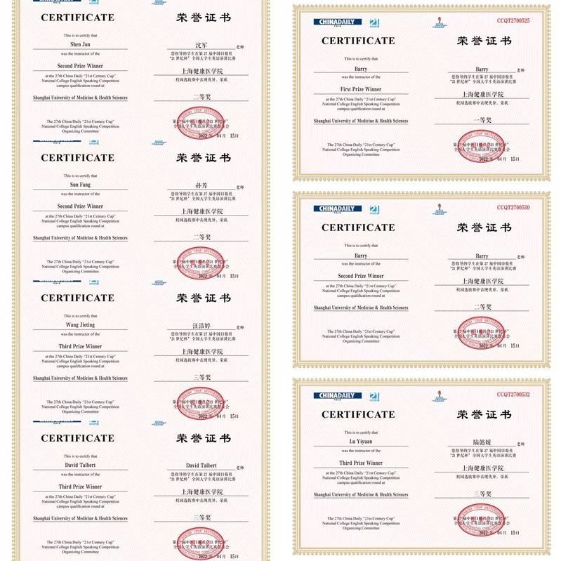 中国日报社“21世纪杯”全国英语演讲比赛引导青年树立和践行社会主义核心价值观,培养中国青年学生的国际交流能力,促进中国青年与世界青年的对话与沟通,为国际传播事业储备生力军。外语教学部骨干教师团队针对“21世纪杯”比赛从去年启动开始进行线上线下多轮选拔和培养工作。经过专业的培训后,共计74名学生获得校赛一、二、三等奖。同时团队老师沈军、路君、孙芳、汪洁婷、孔祥龙、阮俊斌、陆懿媛、David Talbert、Barry获指导老师奖。