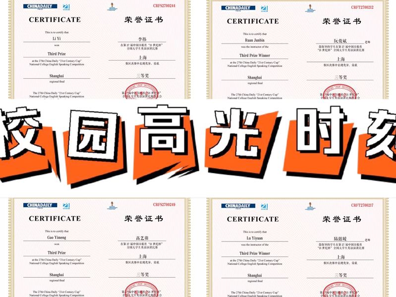中国日报社“21世纪杯”全国英语演讲比赛引导青年树立和践行社会主义核心价值观,培养中国青年学生的国际交流能力,促进中国青年与世界青年的对话与沟通,为国际传播事业储备生力军。外语教学部骨干教师团队针对“21世纪杯”比赛从去年启动开始进行线上线下多轮选拔和培养工作。经过专业的培训后,共计74名学生获得校赛一、二、三等奖。同时团队老师沈军、路君、孙芳、汪洁婷、孔祥龙、阮俊斌、陆懿媛、David Talbert、Barry获指导老师奖。