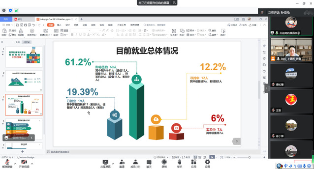 会上,党总支副书记乔慧敏从就业工作进展情况、就业工作面临的难题、目前采取的具体措施三个方面,对学院的整体就业情况进行了介绍。她表示当前疫情之下就业形势严峻,学院上下凝心聚力,精准施策,坚持一人一策,始终把就业工作作为重中之重,坚定保就业的决心和信心。毕业班辅导员从班级就业情况、近期工作、工作困难、工作计划等方面对各自班级情况进行汇报,在汇报过程中着重对未就业毕业生的求职进展进行了交流,同时就学生在就业中遇到的问题进行沟通。随后,教研室主任进行发言,表示会加强教研室研讨和责任落实,利用一切可以利用的资源,尽全力推进就业工作。