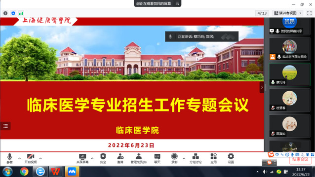 6月24日上午,学院邀请部分兄弟学院(部),召开了临床医学专业招生介绍专题会。2022年,临床医学专业招生计划共涉及六个外省,分别由医学影像学院、药学院、医学技术学院、基础医学院、文理教学部对接招生工作,相关学院(部)负责招生专员参会。会上,蔡巧玲院长从临床医学专业基本情况、专业特色、教学基地、国际合作以及就业率等考生所关心的热点问题,向相关招生专员做了介绍,以便更好的回答考生关于临床医学专业的问题。