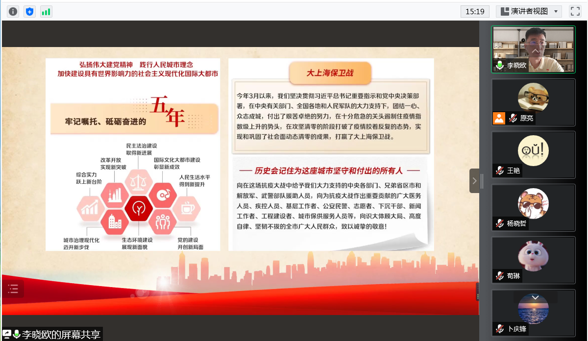 学院张培茗副教授讲到,市第十二次党代会报告全面回顾了上海走过的极不寻常、极不平凡的五年历程,展现了上海在以习近平同志为核心的党中央坚强领导下,在综合实力、改革开放、城市建设、抗击疫情等各方面取得的成就,并明确了强化“四大功能”目标、深化“五个中心”建设、发展“五型经济”等奋斗目标,回顾过往令人倍感激励,展望未来让人倍增信心。在过去的三个月里,面对严峻复杂的新一波新冠疫情,我们自上而下把思想、行动统一到习近平总书记重要讲话精神和党中央的决策部署上来,按照市委市政府、校党委工作部署,以坚定意志和坚决行动紧紧团结全校职工,在疫情这场大考中,主动亮身份、战斗在一线,展现了共产党员的担当。在认真学习领会党代会精神后,作为上海健康医学院一线教师的一份子,未来我会更加认真贯彻习近平总书记提出的“学为人师、行为世范、立德修身、潜身治学、开拓创新”重要精神,为祖国教育事业的发展凝心聚力、持续奋斗,为把学校建设成特色鲜明的高水平应用型医学院添砖加瓦。