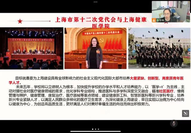 “双带头人”党支部书记 孙博文:党的十九大以来,习近平总书记连续四年亲临上海,考察指导工作,作出重要指示、交办重大任务、赋予重大使命,为上海发展指明了前进方向。郭永瑾书记也讲到这些年我们学校培养了一大批全科医生、急救医生、康复、护理专业毕业生等,他们为疫情防控作出重要贡献,以实际行动交出“健康人”的高分答卷,是经得起检验的。作为一名教师,我将牢记自己的责任和使命,为学校人才培养尽一份力。