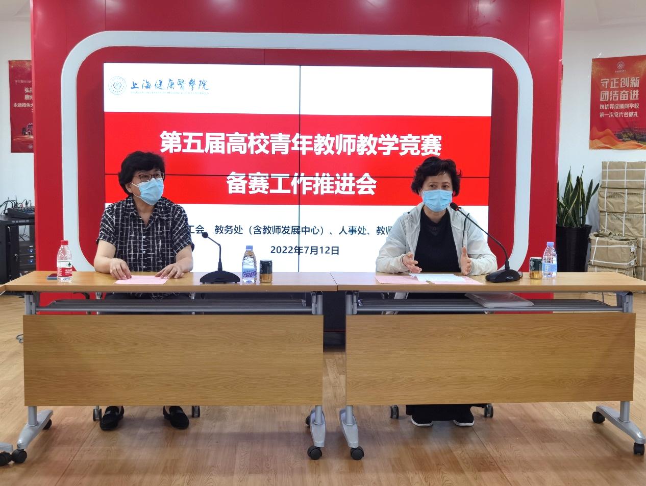 2022年7月12日下午,由学校青教赛工作组主办的第五届高校青年教师教学竞赛备赛工作推进会在北苑1号楼500会议室召开。校党委副书记、副校长唐红梅,党委副书记、工会主席于莹,工会常务副主席凌文惠,教务处处长、教师发展中心主任王莉,党委教师工作部部长金东英、人事处副处长黄寅、各学院及教学部分管教学院长、第五届上海高校青教赛参赛选手、各学院教学部青年教师代表70余人以线上线下方式参加了培训会。会议由凌文惠主持。