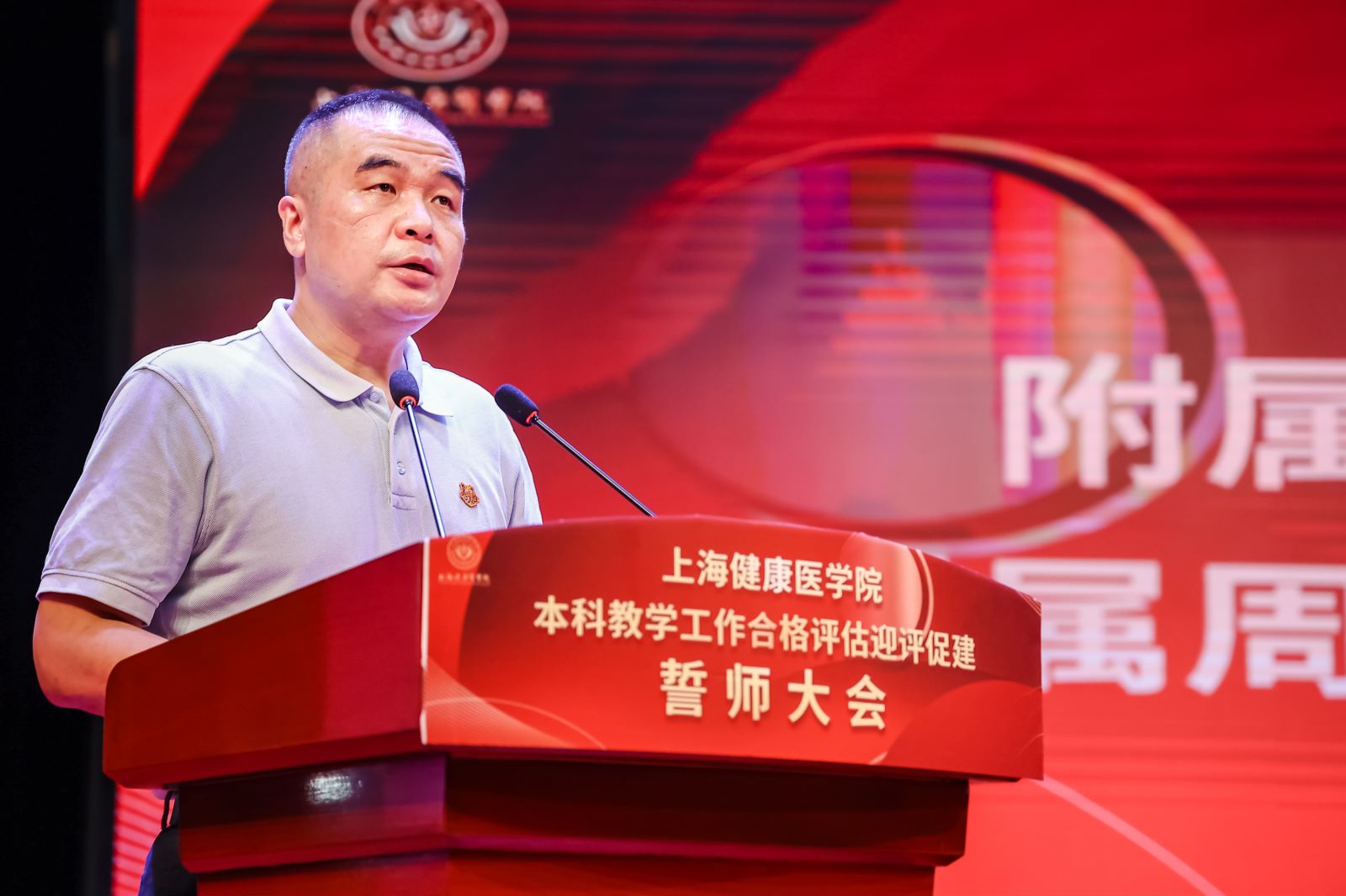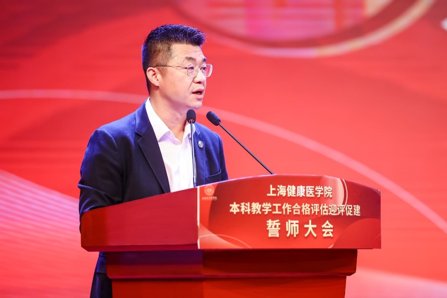 为动员全校师生,打赢迎评百日攻坚战,7月15日,上海健康医学院隆重举行本科教学工作合格评估迎评促建誓师大会,校党委书记郭永瑾主持会议,校长吴韬作动员讲话。按照疫情防控要求,会议分为线上和线下两个会场,全体校领导、全体中层干部、附属医院代表、教师代表、学生代表、评建办相关人员出席会议。全体教职员工、附属医院和社区卫生服务中心相关人员线上参会。
