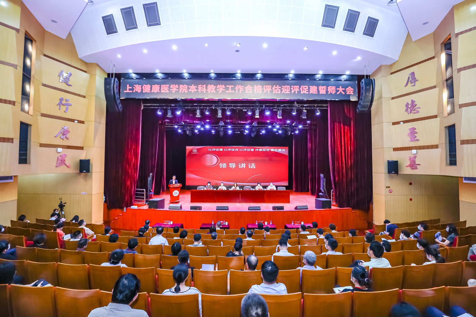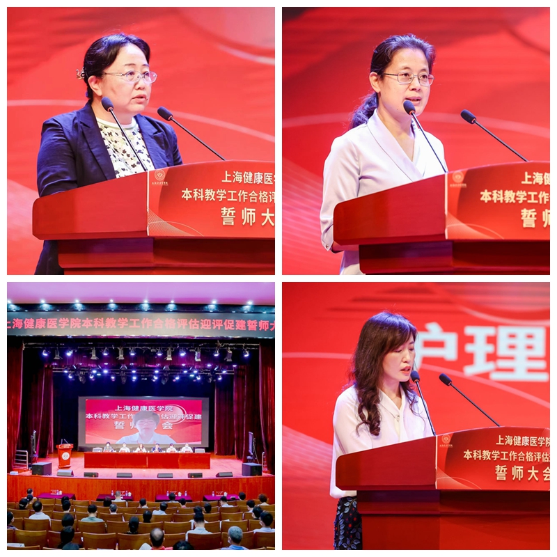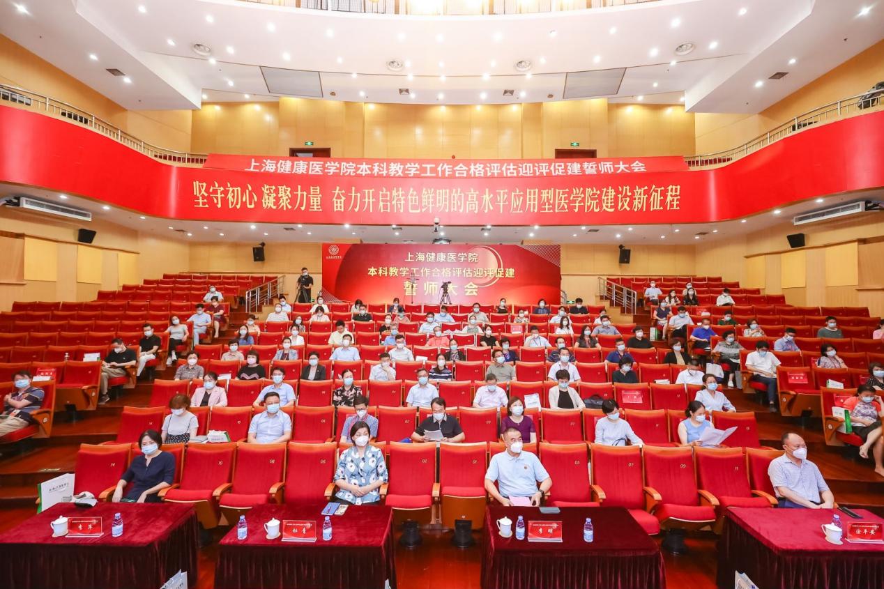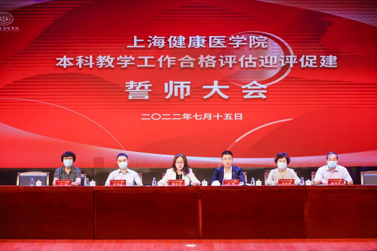 为动员全校师生,打赢迎评百日攻坚战,7月15日,上海健康医学院隆重举行本科教学工作合格评估迎评促建誓师大会,校党委书记郭永瑾主持会议,校长吴韬作动员讲话。按照疫情防控要求,会议分为线上和线下两个会场,全体校领导、全体中层干部、附属医院代表、教师代表、学生代表、评建办相关人员出席会议。全体教职员工、附属医院和社区卫生服务中心相关人员线上参会。