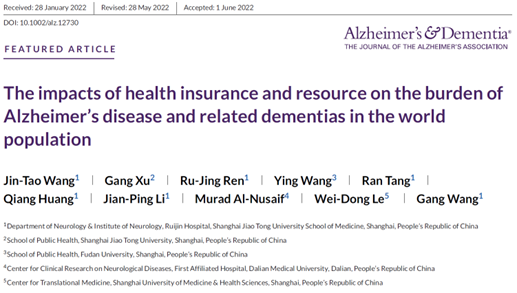 2022年7月12日,上海健康医学院协同科研中心临床与转化医学研究中心乐卫东教授团队与上海交大医学院附属瑞金医院神经科王刚教授团队合作的最新成果“The impacts of health insurance and resource on the burden of Alzheimer's disease and related dementias in the world population”在线发表在《Alzheimers Dement》上。临床与转化医学研究中心乐卫东教授是该论文的共同通讯作者。