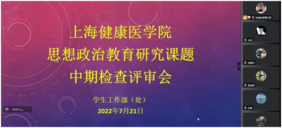 为进一步推进学校思想政治工作高质量发展,不断提升我校辅导员队伍科研素养和科研水平。根据《上海健康医学院思想政治教育研究课题管理办法》,7月21日上午,学工部组织召开线上思想政治教育研究课题中期检查评审会。会议邀请上海大学学工办副主任马成瑶副教授,上海大学文科处副处长金桥副教授,上海师范大学马克思主义学院党委副书记、副院长孙琳副教授担任评审专家,针对我校35项思政研究课题,采取线上答辩和书面评审结合的方式进行中期验收。