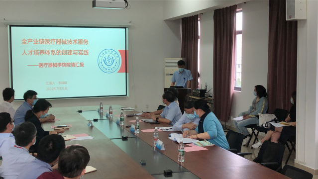 7月21日上午,医疗器械学院在新南苑18号楼504室开展医疗器械学院本科教学工作大督查,校外专家张平伟、吴仁友,学校副校长沈国芳、教务处处长王莉、副处长蒋淑敏,医疗器械学院党总支书记、副院长李晓欧。党总支副书记吕杰、副院长张欣和各专业主任参加了此次本科教学工作大督查会议,王莉主持会议。