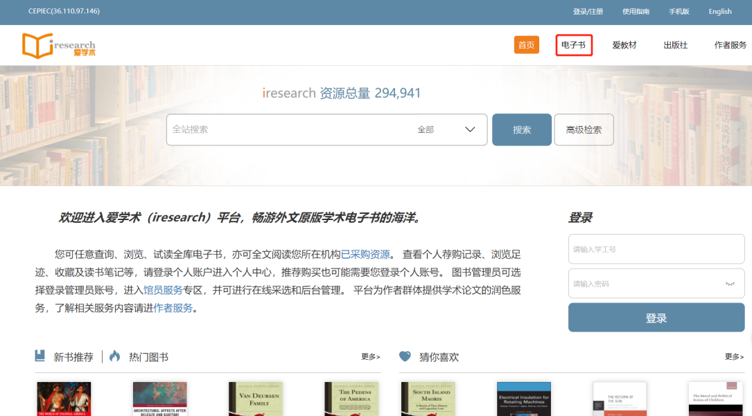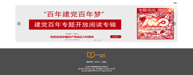 访问平台首页www.iresearchbook.cn,点击右上角的电子书