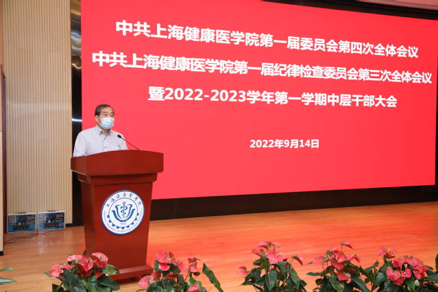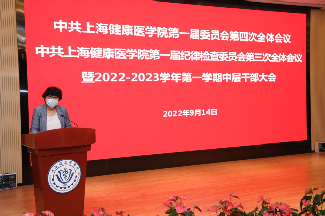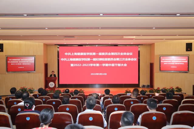 9月14日下午,中共上海健康医学院第一届委员会第四次全体会议、中共上海健康医学院第一届纪律检查委员会第三次全体会议暨秋季学期中层干部会议在北苑1号楼200人报告厅举行。校党委书记郭永瑾,党委副书记、纪委书记李明磊,党委副书记、副校长唐红梅,党委副书记于莹,副校长沈国芳,全体党委委员、纪委委员以及全体中层干部参加会议。会议由党委书记郭永瑾主持。