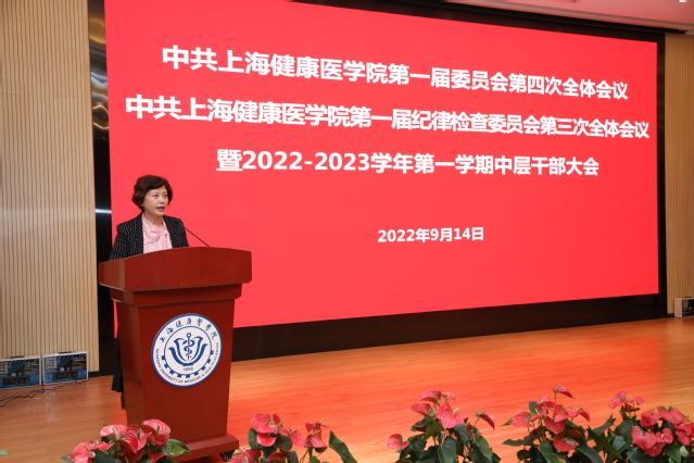 9月14日下午,中共上海健康医学院第一届委员会第四次全体会议、中共上海健康医学院第一届纪律检查委员会第三次全体会议暨秋季学期中层干部会议在北苑1号楼200人报告厅举行。校党委书记郭永瑾,党委副书记、纪委书记李明磊,党委副书记、副校长唐红梅,党委副书记于莹,副校长沈国芳,全体党委委员、纪委委员以及全体中层干部参加会议。会议由党委书记郭永瑾主持。
