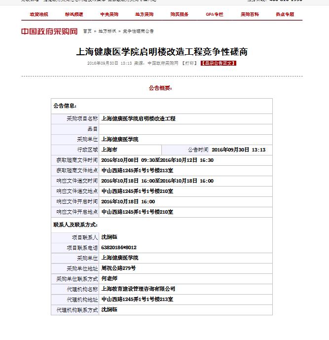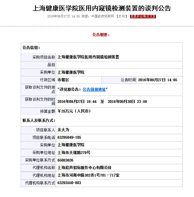 上海健康医学院医用内窥镜检测装置的谈判公告