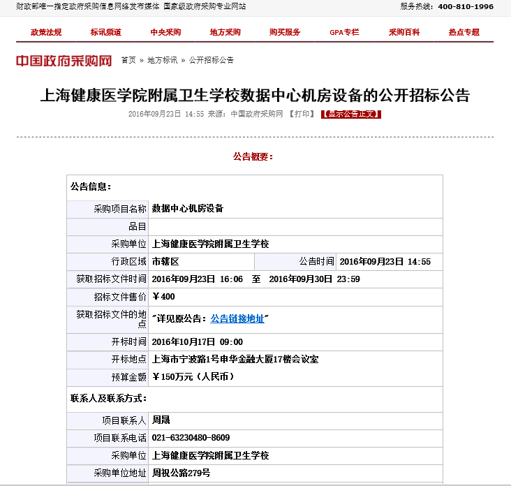 上海健康医学院附属卫生学校数据中心机房设备的公开招标公告