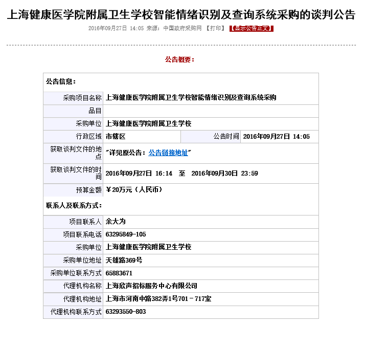 上海健康医学院附属卫生学校智能情绪识别及查询系统采购的谈判公...