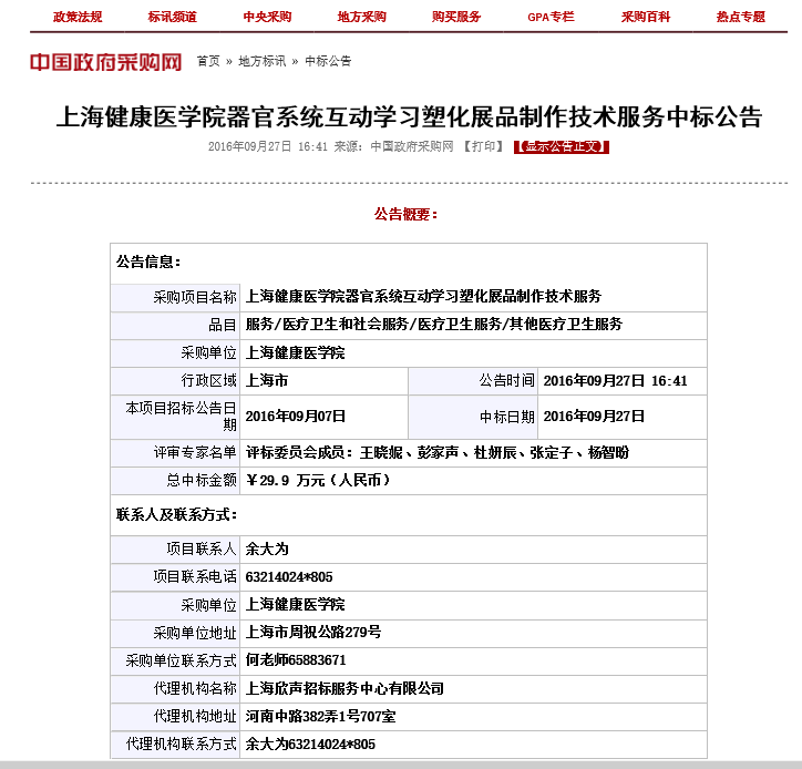 上海健康医学院器官系统互动学习塑化展品制作技术服务中标公告