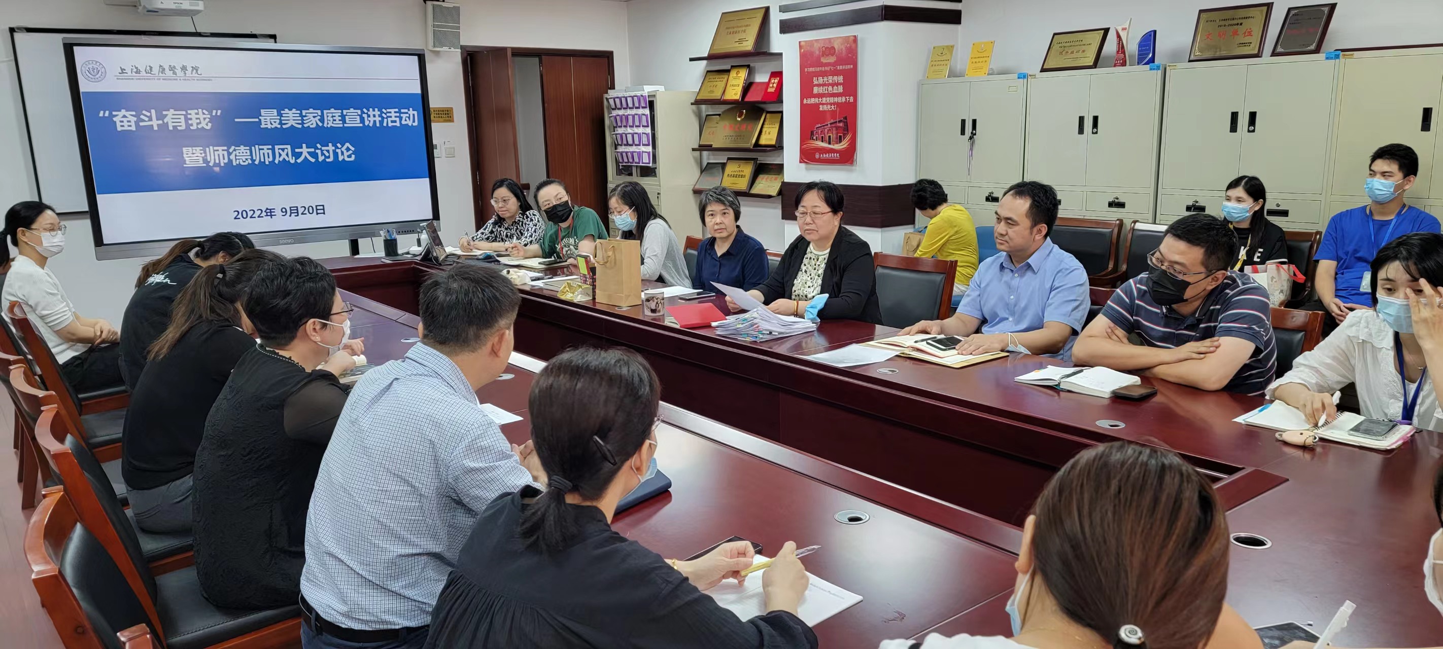 为进一步加强师德师风建设,广泛宣传“最美家庭”的感人故事,以榜样精神凝聚前行力量,9月20日,教务继教联合直属党支部开展“‘奋斗有我’——最美家庭宣讲活动暨师德师风大讨论”活动,支部全体教职工参加会议,校工会副主席芦静出席会议,会议由支部书记王莉主持。