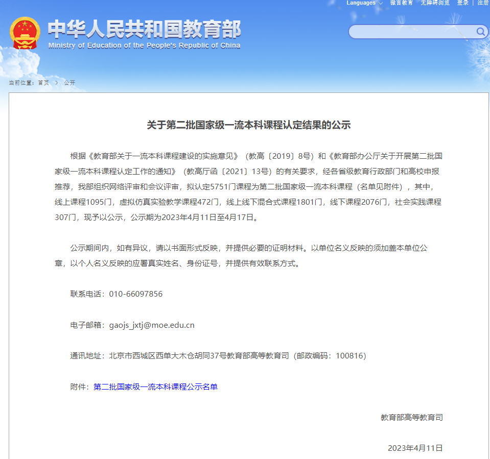 近日,教育部公示了第二批国家级一流本科课程认定结果,我校共有2门课程入选,连同2018年度获批的1项国家虚拟仿真实验教学项目,学校共有3门课程获批国家级一流本科课程,标志着学校在一流本科课程建设方面取得了阶段性突破。