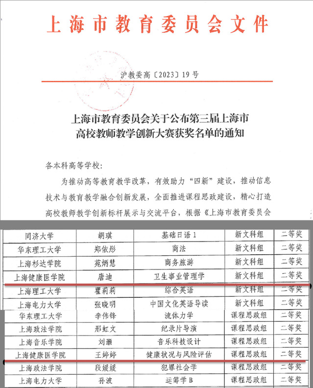 近日,上海市教育委员会发布《关于公布第三届上海市高校教师教学创新大赛获奖名单的通知》,我校护理与健康管理学院王婷婷老师、健康与公共卫生学院唐迪老师分获课程思政组、新文科组二等奖。