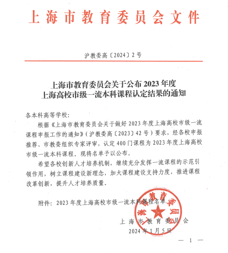 近日,根据《上海市教育委员会关于公布2023年度上海高校市级一流本科课程认定结果的通知》(沪教委高〔2024〕2号),我校组织推荐申报的《天然药物化学》等4门课程被认定为2023年度上海高校市级一流本科课程。