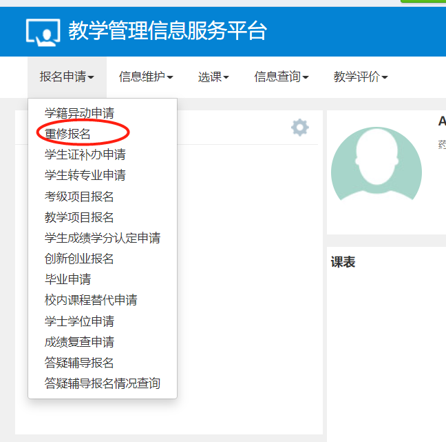 1. 进入“重修报名”模块