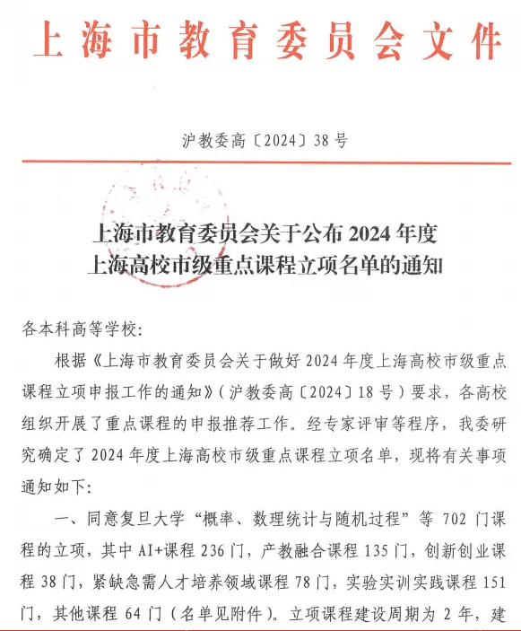 近日,上海市教委发布了《上海市教育委员会关于公布2024年度上海高校市级重点课程立项名单的通知》(沪教委高〔202438号),我校推荐的9门课程获批立项,其中,AI+课程2门、产教融合课程4门、紧缺急需人才领域课程1门、实验实训实践课程2门。