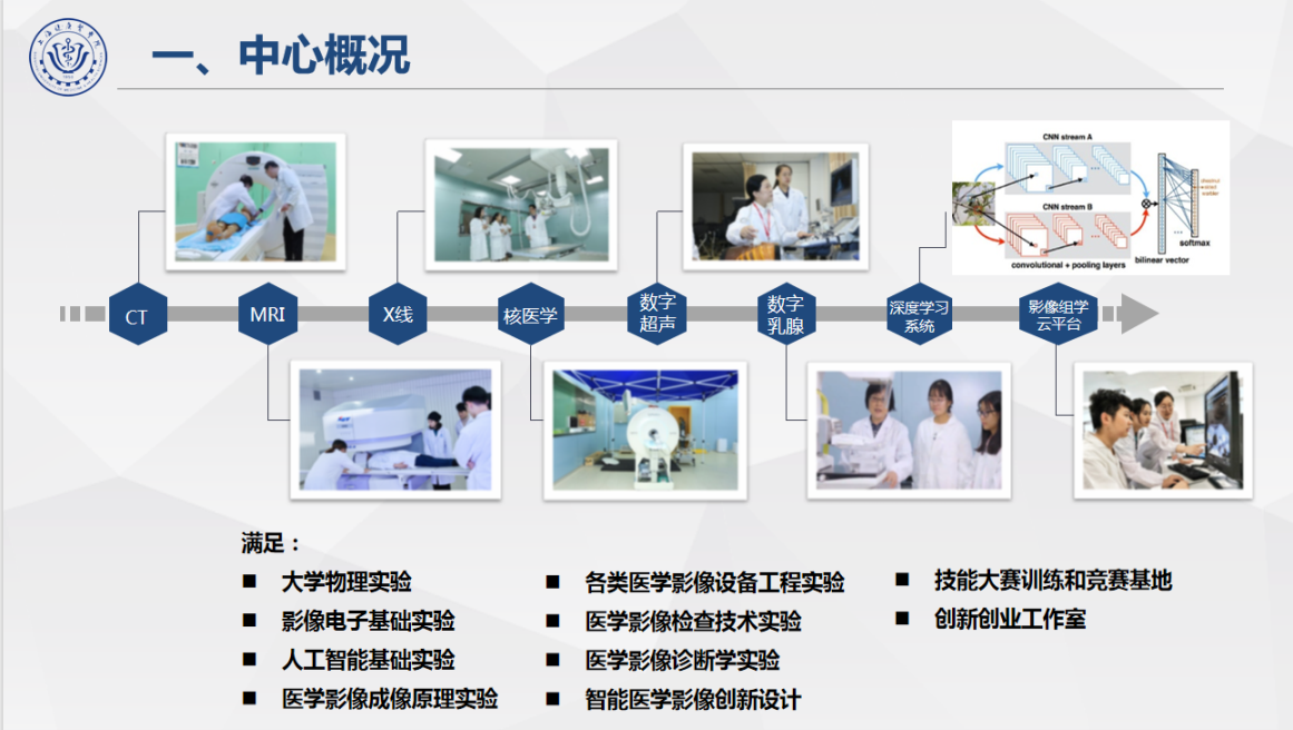 上海市医学影像实验教学中心共计3735㎡,拥有CT、核磁共振、数字化X线机、超声和核医学等5大类医学影像设备。中心聚焦现代医学影像技术人才“有温度,多维度”能力培养体系建设,积极开展实验教学研究,深入推进实验教学改革。同时,根据现代智能化影像技术发展趋势,融入AI+医学影像实验教学新内涵、AI赋能实验教学新模式等理念。构建“医教研赛”协同育人实践教学平台,形成理实一体、虚实融合、线上线下混合、校内外共享的实验教学形态。其中,《MRI检查技术》在线实验课程2020年以来开放网络实验资源惠及92所高校,实验人次达45万。