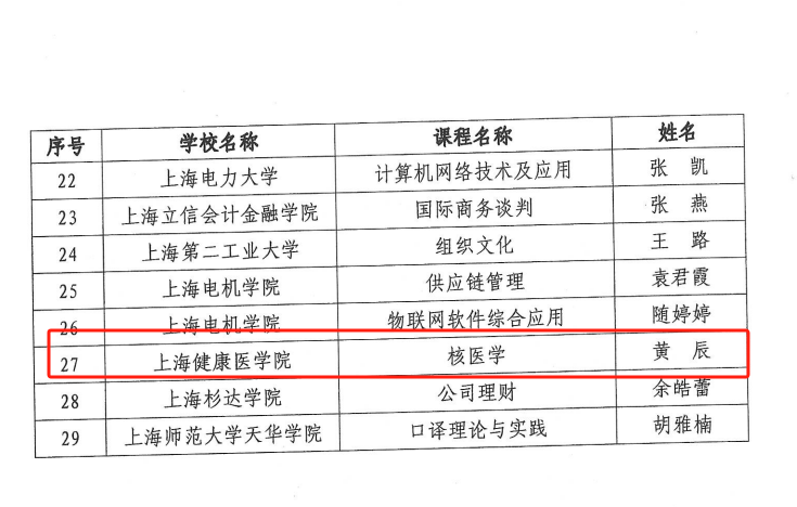 近日,市教委下发了《上海市教育委员会关于公布2024学年度“上海高校示范性本科课堂”名单的通知》(沪教委高〔2024〕54号),我校医学影像学院黄辰老师的《核医学》课程成功入选。