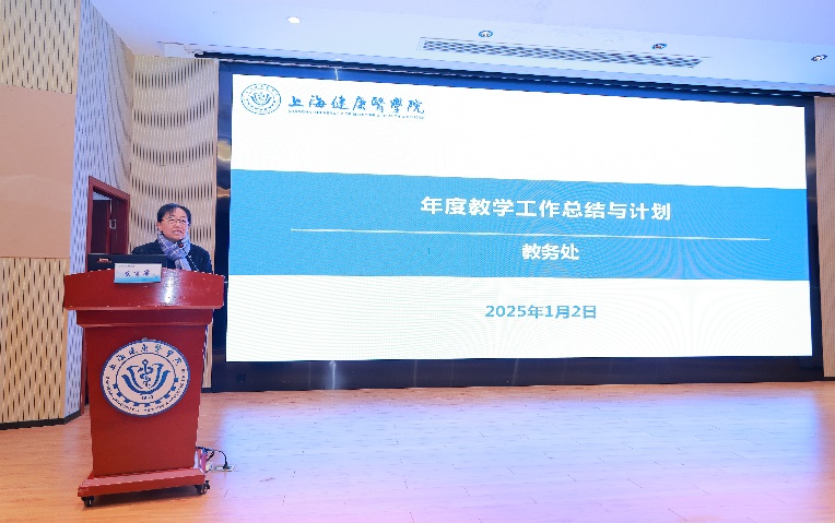 最后,吴韬代表学校对全体教职工,包括附属医院、教学医院及社区卫生服务中心在过去一年中的辛勤付出表示衷心的感谢和崇高的敬意。2024年学校在高校分类评价工作中取得历史突破,主要体现在三个“聚焦”和“聚力”,一是聚焦教育的政治属性、人民属性和战略属性,聚力培养应用技术型医药卫生人才;二是聚焦高教综改“1+10”要求,聚力不断深化教育教学改革;三是聚焦拓展国际合作交流辐射,聚力师生国际教育内涵提升。吴韬指出2025年是教育强国建设全面布局、高位推进之年,也是“十四五”规划收官之年和“十五五”规划谋篇之年。要求学校教育教学工作一是紧紧跟随服务科技发展、国家战略和城市发展需求,积极打造基层卫生健康守门人“金名片”。紧密对接服务经济社会发展主战场,紧紧跟随科技发展和国家战略需求,优化学科专业布局,建设支撑未来产业升级和社会经济发展所需的紧缺专业、未来专业,创新契合科技发展和产业需求的人才培养模式,面向人民健康全面提升服务贡献能级。二是强化战略思维,制定战略策略,保持战略定力,牢牢把握战略主动权,推进“人工智能+”教育教学模式改革。加强数字赋能教学改革,促进实施“科教融汇”,大力营造“以科促教”“科教相长”氛围,注入“科技+”元素实现教学与科研协同并进,促进科教成果转化,提升学校在科教创新领域的贡献度和影响力。三是深化政产学研医用协同,全面提升师生国际竞争力,携手共建人类卫生健康共同体。探索“以人民健康为核心”特色鲜明的“医学院-附属医院-附属社区卫生中心-企业”协同共融发展新样板模式。引进国际优质教育和师资资源,支持更多师生海外研修和培训,鼓励国际联合研究实验室和教研平台成果产出,为构建国际化发展新格局奠定坚实基础。最后他引用习近平总书记的新年寄语“梦虽遥,追则能达;愿虽艰,持则可圆”,勉励大家每一个人都是主角,每一份付出都弥足珍贵,每一束光芒都熠熠生辉,唯有提振“干字当头、奋力一跳”的精气神,锻造特色亮点,才能在迅猛而来的教育改革浪潮中占据一席之地。号召大家紧抓上海高等教育综合改革的宝贵机遇,把优化学科专业布局作为先导任务,把强化人才精准供给作为根本任务,把提升创新策源能力作为关键使命,系统推进学校新质生产力的形成、生长和发展,构建高水平、高质量发展新格局,以优异成绩迎接建校十周年!