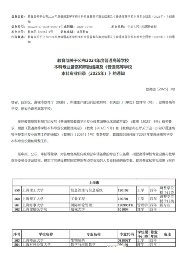 4月22日,教育部印发《关于公布2024年度普通高等学校本科专业备案和审批结果及《普通高等学校本科专业目录(2025年)》的通知》(教高函〔2025〕3号),我校申报的眼视光学(专业代码101004、理学)本科专业成功获批,标志着我校成为上海市唯一一所获准开设此专业的高校。